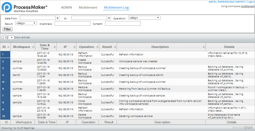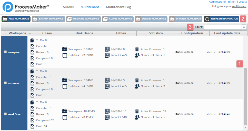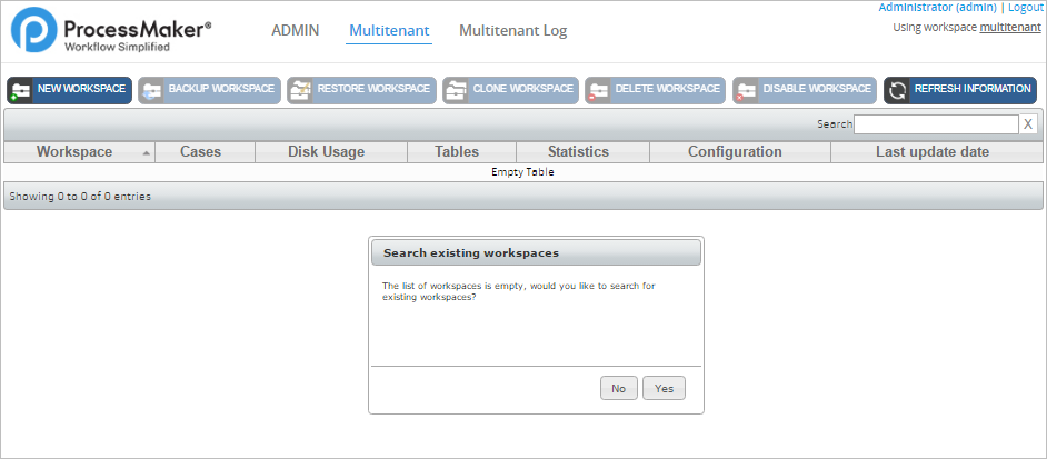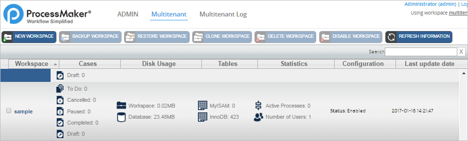 The Multitenant Workspace Management plugin allows a super user to manage workspaces directly inside the ProcessMaker interface. After logging into the Multitenant workspace, the super user will be able to: