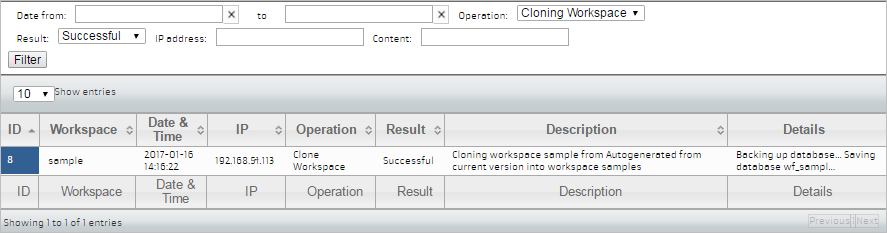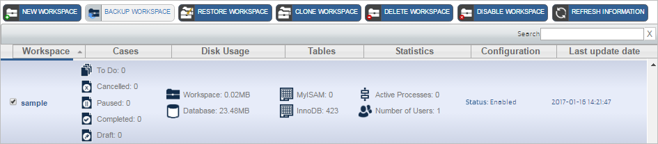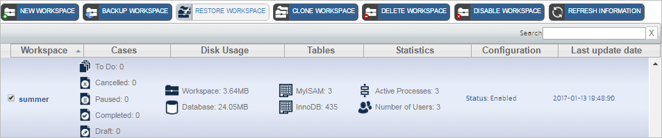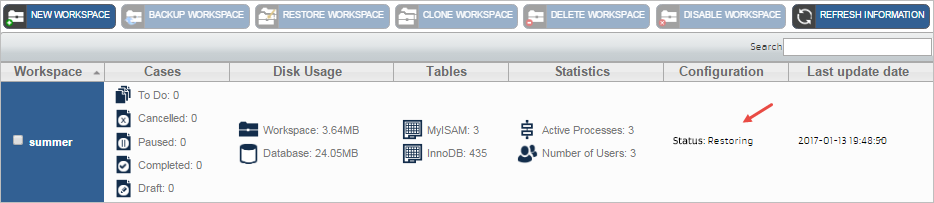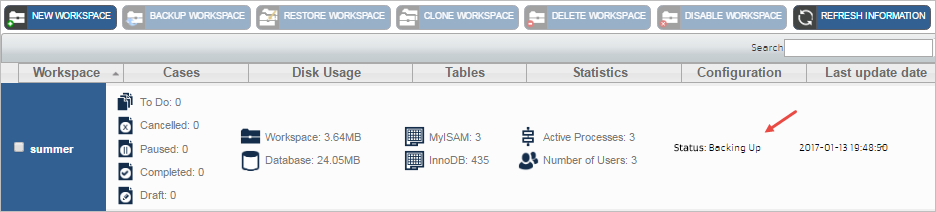 Once the workspace backup process has finished, the workspace status will be set back to Enabled and the following email message will be sent to the user who executed this operation: