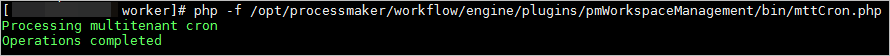 In order for pending actions to be executed in the Multitenant Workspace Management plugin, the mttCron.php file must be executed. This file can be manually executed by opening a command-line terminal on the server where ProcessMaker is installed and issuing the following commands: