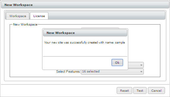 Click No to close the window and return to the creation window, or click Yes to start the creation of the new workspace. After the workspace has been created, a new message window will appear to confirm that the workspace was created: