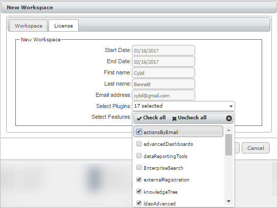 Select this option to start the creation of a new workspace with a valid enterprise license. Fill in the following information about the new workspace: