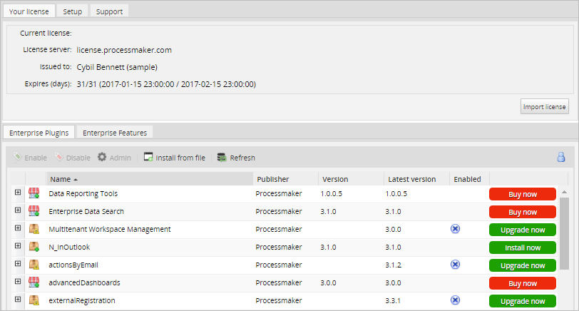When accessing the new workspace, it won't be necessary to upload a license file. The details of the license created with the workspace will be displayed inside the Plugins section under the Admin tab. Plugins that weren't included in the license will be available through the Buy Now button.