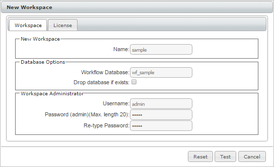• Database options. This section defines the MySQL database that will be created to hold data for the new workspace. Each database name can only have 16 characters or less. By default, the prefix "wf_" is added to the workspace name.