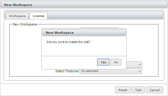 After filling out both forms, click on Test to check whether the entered values are valid and don't conflict with the names of existing MySQL databases. A new message window will open asking if you want to create the new workspace.