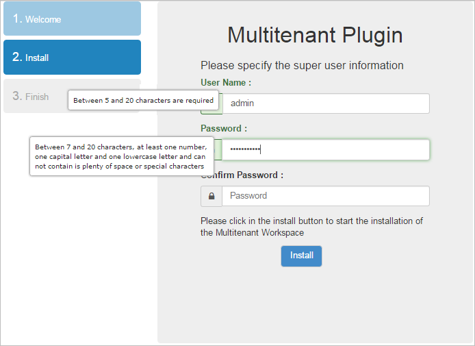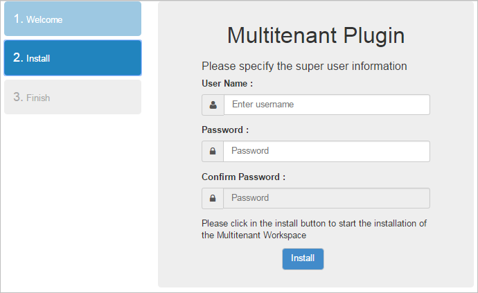 In the next screen, specify the super user who will manage the workspaces. Take note of these credentials, they will be used to log in to the Multitenant Workspace Management interface.