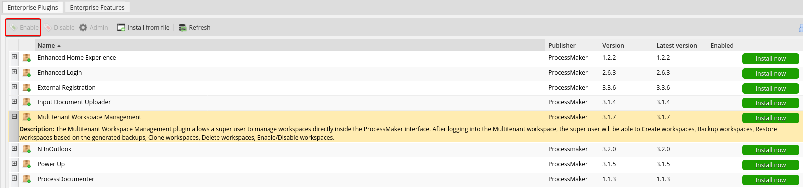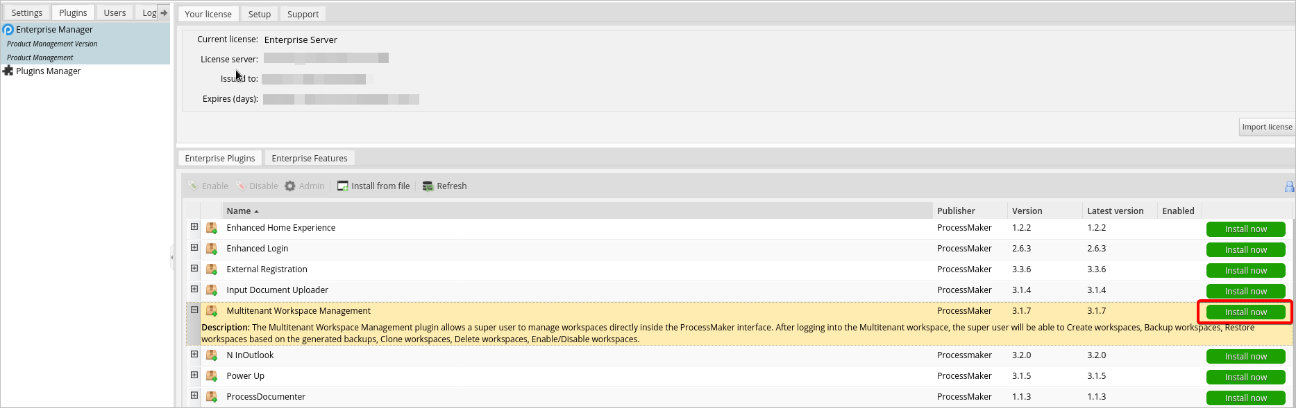 Login as a user, such as "admin", who has the PM_SETUP and PM_SETUP_ADVANCED permissions in their role. Then, go to ADMIN > Plugins > Enterprise Manager. Either install the Multitenant Workspace Management plugin by clicking on Install from File and uploading the plugin file or by clicking on its Install Now button in the list of available plugins.