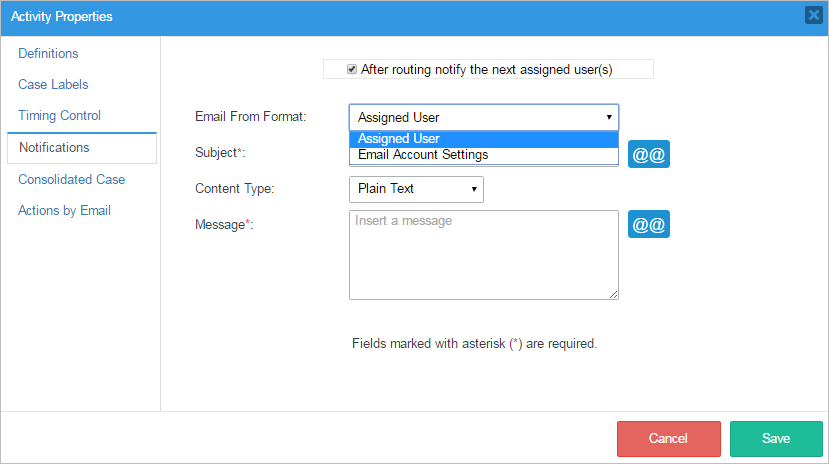 The subject line and body of these email notifications can be customized, and system variables and case variables can be inserted to personalize the email for the recipient using data from the current case.