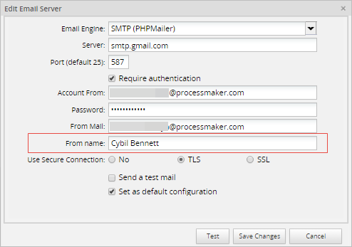 - Email Account Settings: This option sends the email using the Email From value defined as the default configuration in the Edit Email Server window.