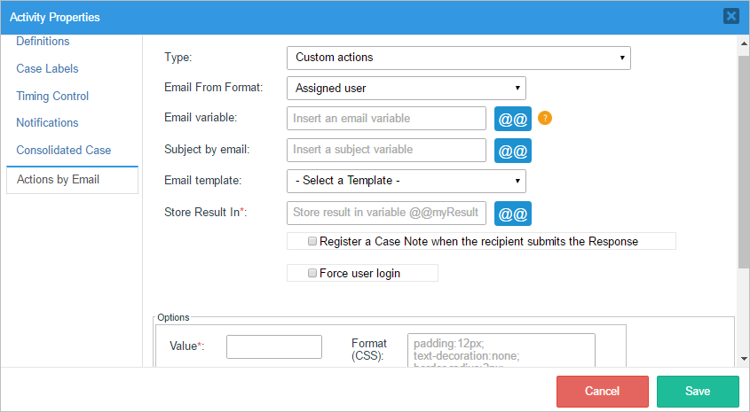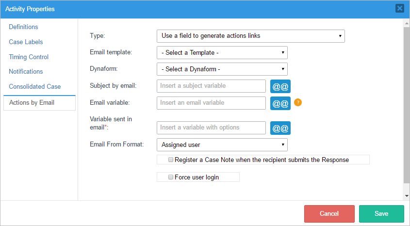 - As a best practice, do not configure the current task to use Actions by Email, and then route cases of this task from the email to tasks that require manual assignment. This will cause errors in case run time because there is no way in the email to manually select a user in which to assign the task.