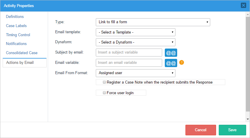 - Link to fill a form: A link to a form is sent to the user's email. When the user submits the form, it saves any data entered into the form and routes the case to the next task in the process.