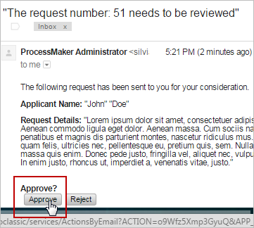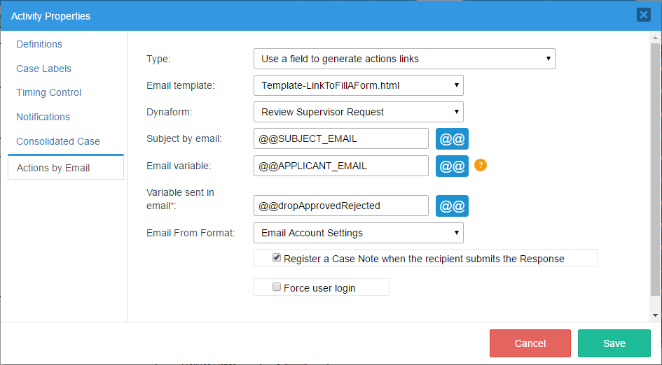 - Use a field to generate actions links: The user will be able to approve or reject the information sent via email. It routes the case onto the next task depending on the link that the user clicked in the email.