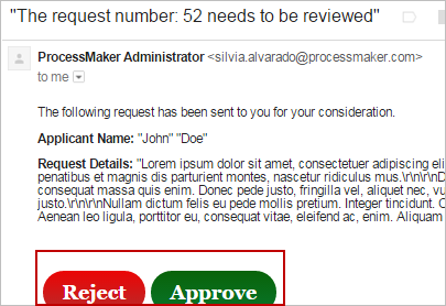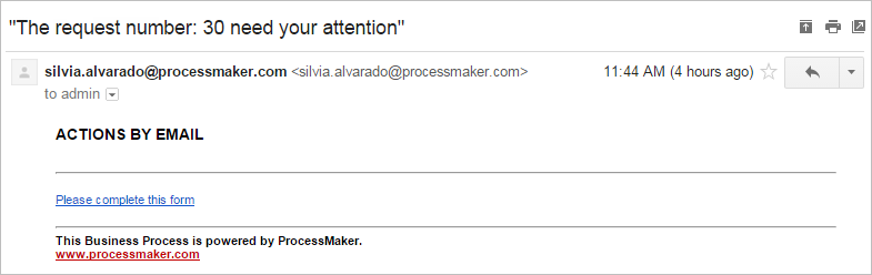 Actions by Email is a feature available in the ProcessMaker Enterprise Edition. This feature allows users to receive an email where they can send information to ProcessMaker cases and also route those cases onto the next task in the process. The email can contain a link to a form stored on the ProcessMaker server to be filled out and submitted, a group of links that can be clicked to accept or reject information in the email, or multiple different options customized by the designer. Actions by Email was originally created to allow people who are not registered users in ProcessMaker to work on cases, but it can also be used by registered users who wish to work on cases without having to log into the ProcessMaker interface.