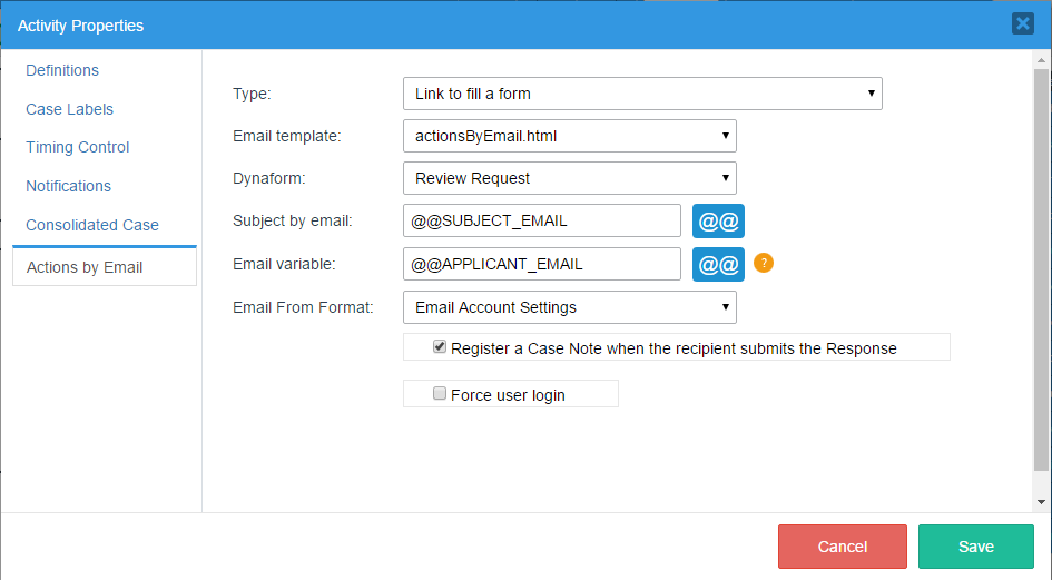 Also take into consideration that the email address where the action is sent by email must belong to the user that will be assigned to the Action by Email task. The Force User Login property is available in all the three configuration types.