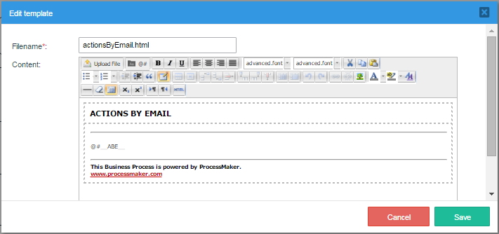 - Email Template: Select the template file that will be used as the content of the email. Actions By Email includes a default template file named actionsByEmail.html, which can be used for testing purposes. To learn how to create an email template, see this documentation.