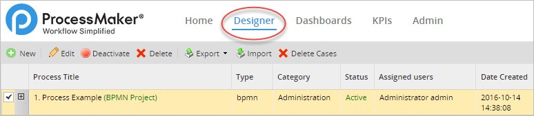 - Active: To change the status of a project to "Active" so cases can be executed in a process, first select the project in the list and then click on this button.