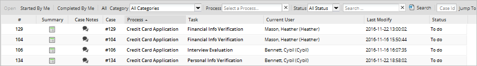 - Started by me: Only the cases started by the current user will be shown in the list.