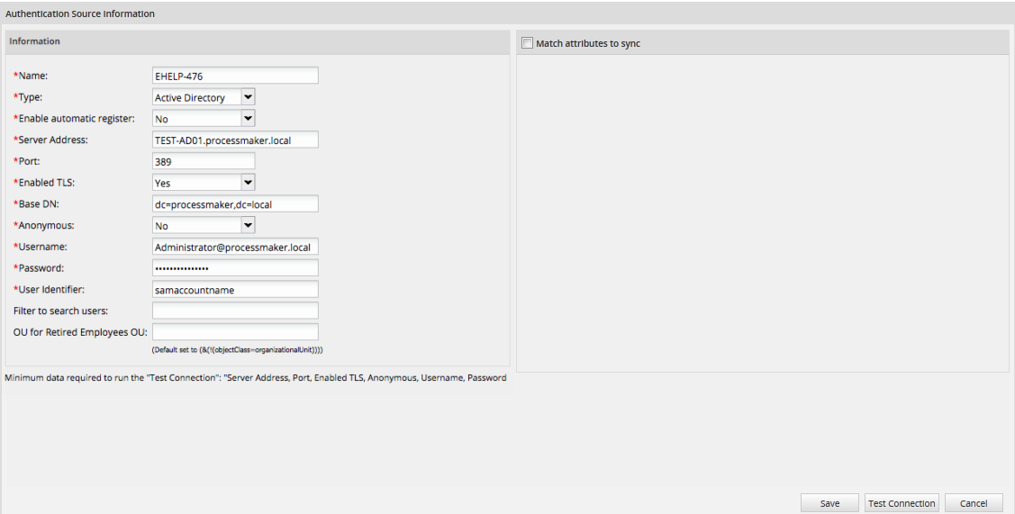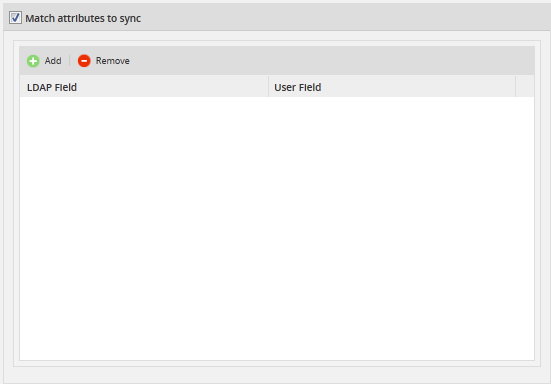 - Match attributes to sync: Mark this checkbox to map user attributes in the authentication source to fields in ProcessMaker's