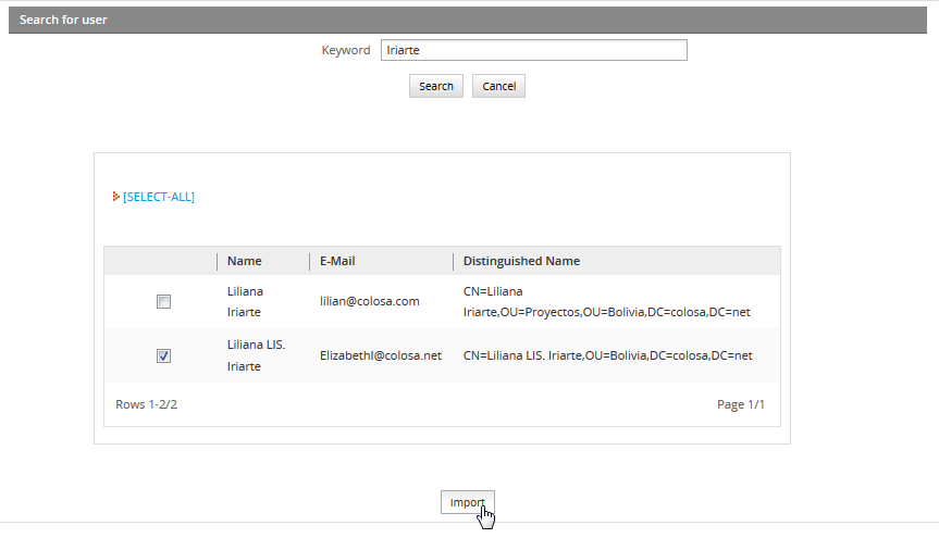 Search for the user who will be imported to ProcessMaker. Select the user and click Import: