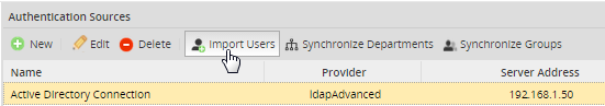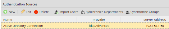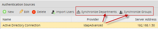 To configure which departments and groups will be synchronized, go to Admin> Users Authentication Sources and select an authentication source in the list that uses Advanced LDAP. The Synchronize Departments and Synchronize Groups options will be enabled: