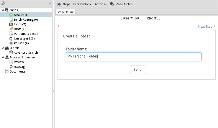 After starting a case, the first Dynaform displays to fill in the name of the folder that will be created inside the Alfresco server. In this example, the name is "My Personal Folder". Click Send.