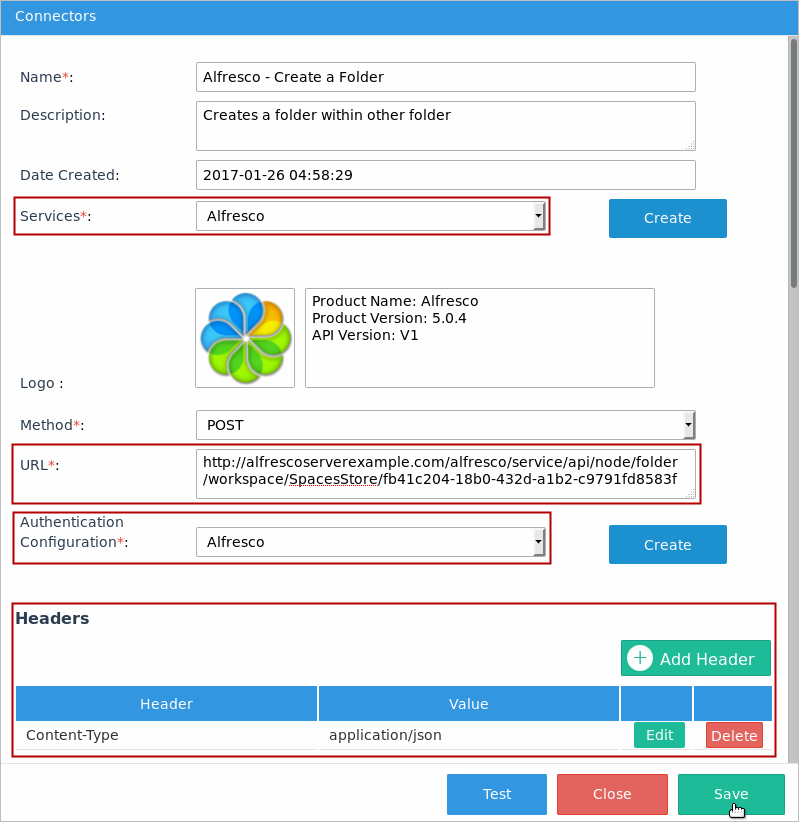 http://alfrescoserverexample.com/alfresco/service/api/node/folder/workspace/SpacesStore/fb41c204-18b0-432d-a1b2-c9791fd8583fIn the Headers section of each connector, add a content type header: