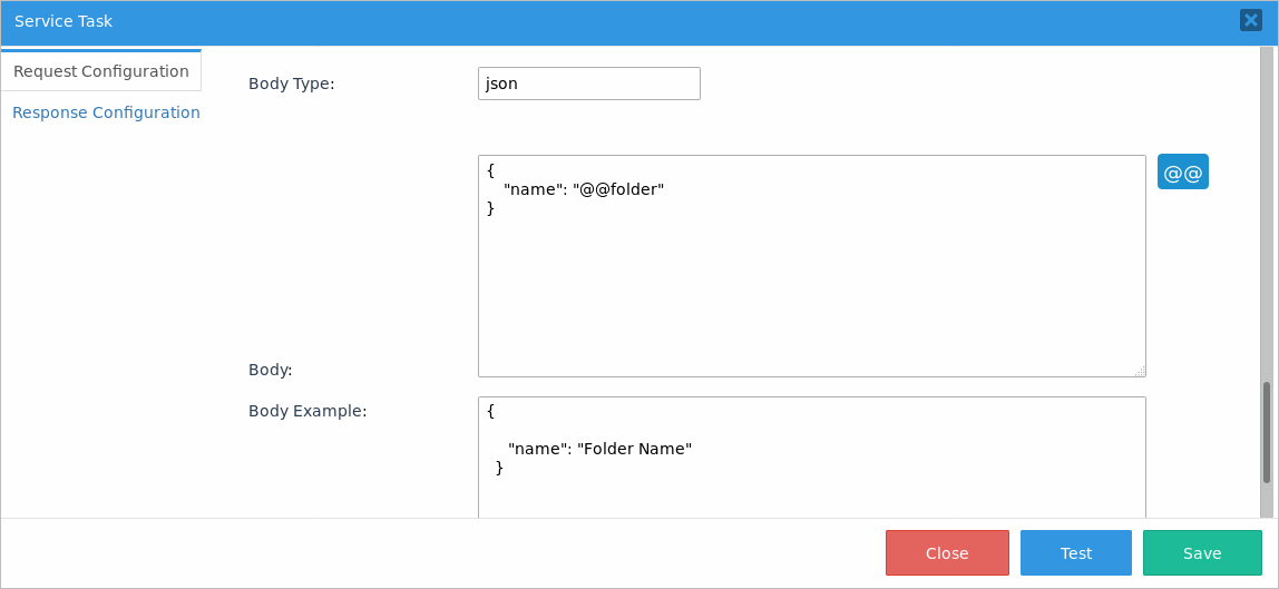 Scroll down the window and fill in the Body field. This connector's JSON body request must include the name of the folder that will be created. Therefore, assign the @@folder variable in the name parameter. This variable contains the name of the folder defined by the user in the first Dynaform.