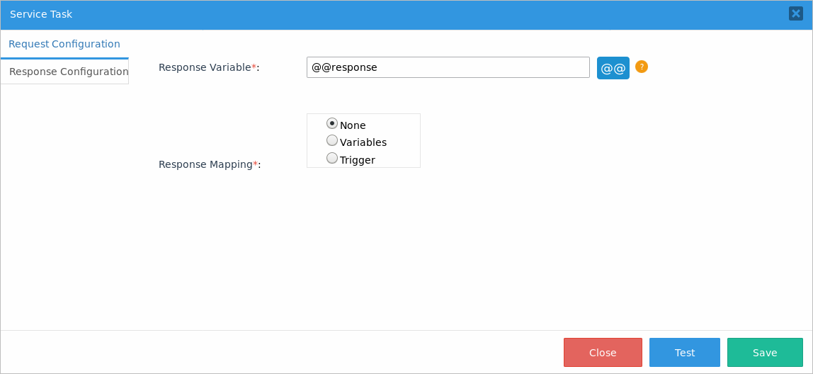 Go to Response Configuration tab. In the Response Variable field, choose the @@response variable to store the response of the connector.