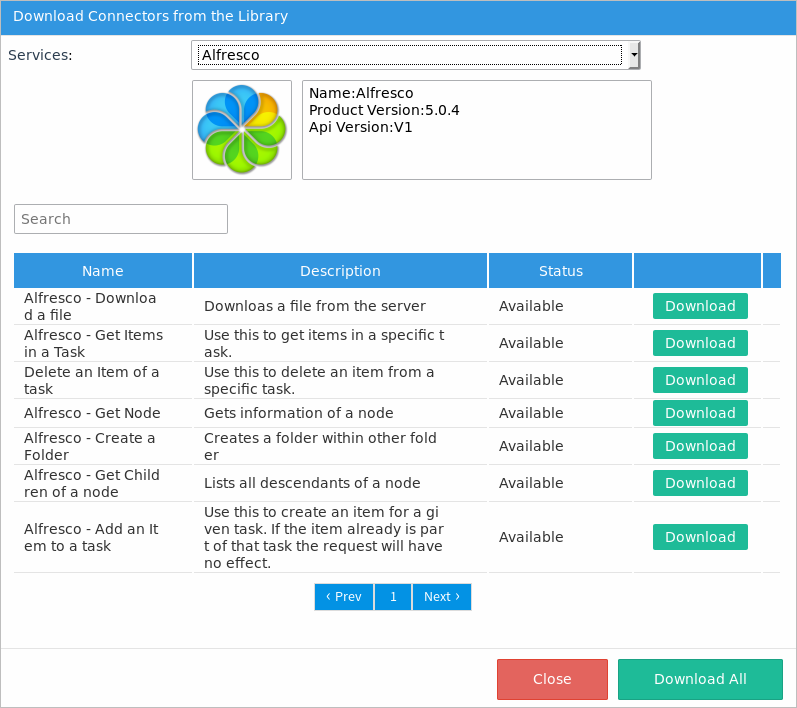 ProcessMaker Enterprise Connectors are available for download through the connector public library to work with Alfresco services.