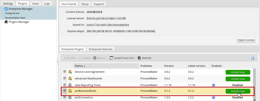 If using ProcessMaker 2.5, the Business Rules plugin will be available once the Enterprise Edition plugin has been imported and its license has been activated. If using ProcessMaker Enterprise Edition 2.8 or later, the Business Rules plugin is available by default.