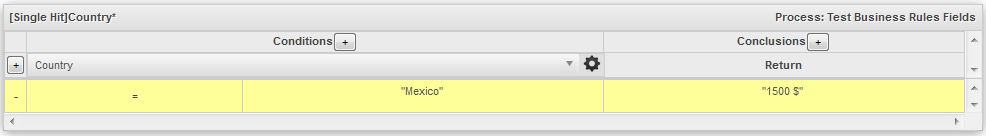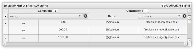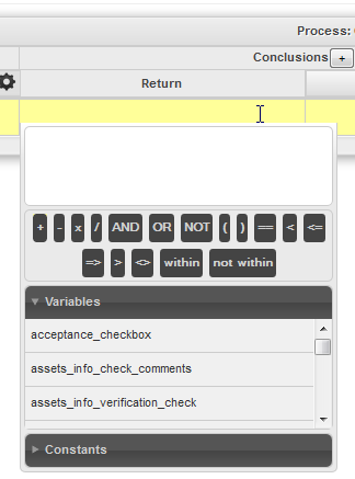 - Conclusions: This section shows the results which are returned if the condition evaluates to true. By default, a true condition only results in a return value. To also set the value of a case variable when a condition is true, click on the + button to add more conclusion columns.