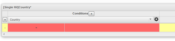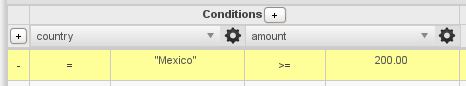 - Conditions: This section defines the conditions which will be evaluated. Click on the + button to add additional condition columns. See Defining conditions in a Business Rule Set below.
