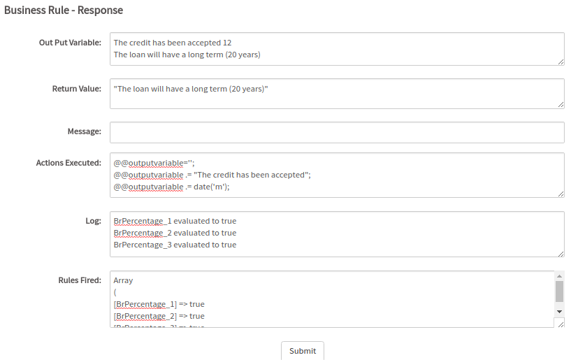- array rulesFired: An associative array, where the keys are the name of the rule set and the number of the condition, starting from 1, and the value is true or false, depending on how the condition evaluated.