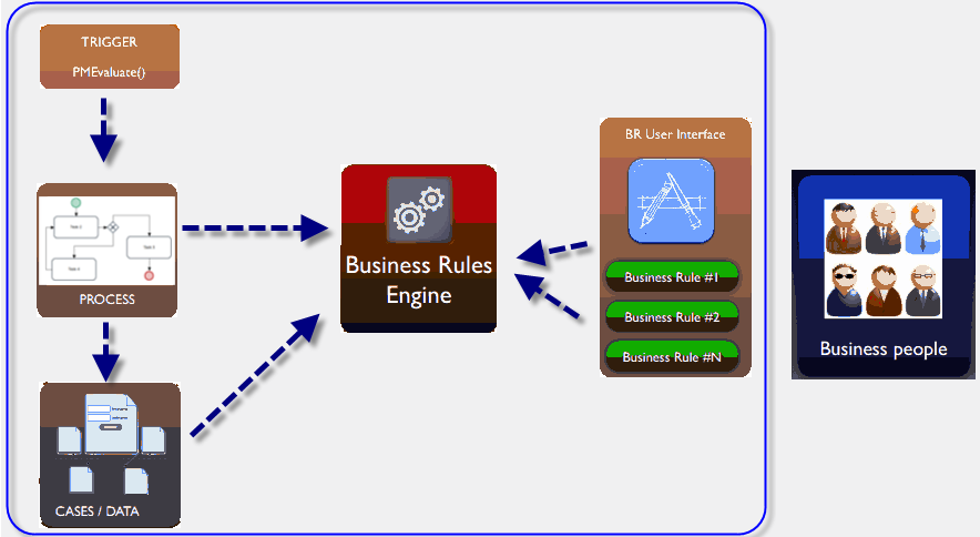 The Business Rules plugin helps process designers to define business logic rule sets and share them among cases. These rules are defined for each process by using a graphical interface that requires no coding, making rule definition easy to do. The rule sets are executed by a trigger.