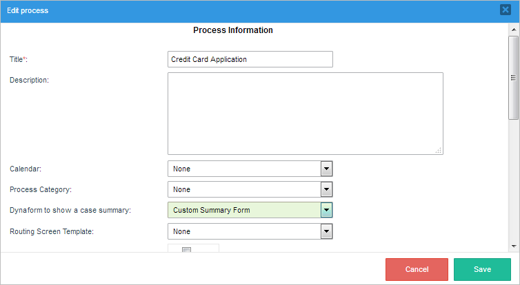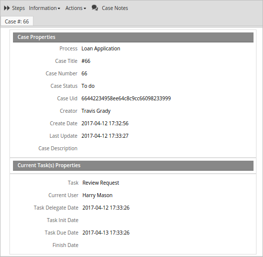 The Case Summary shows generic information about the state of a case, such as when the case was started, last updated and who is currently assigned to work on the case. In addition, the user can create a Dynaform that only displays pertinent information about the case and set this custom Dynaform to be shown instead of the general information when a user opens the case using the Jump to option or a case link