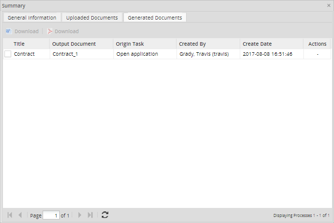 The Generated Documents tab displays the list of output documents that have been generated during the case. These files can be downloaded in PDF or DOC format, depending on the configuration of the output document.