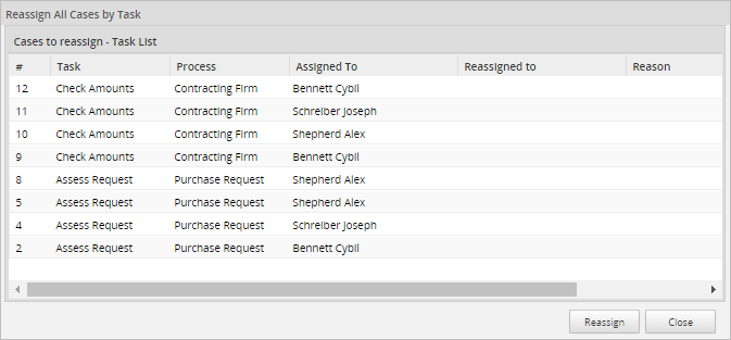 To reassign a case, select the case from the list and double click on the Reassigned to column. A list of users will be displayed where the search option is also available.