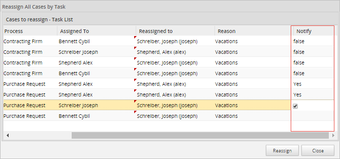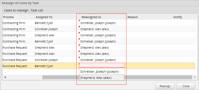 Choose a user who will have the ability to work on the case once this is reassigned. Remember that only users assigned to a case or ad hoc users will be listed in the search option when reassigning a case. After that, double click on the Reason column and fill in the reason why the case is being reassigned.