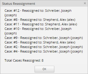 Finally, click the Reassign button to finalize the reassignment process. The Status Reassignment window will be displayed, and the case number and the person who was assigned to the case will be shown. Click on the OK button to close this window.
