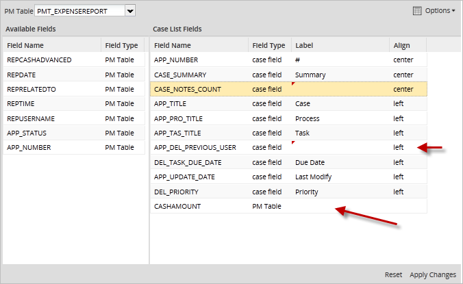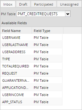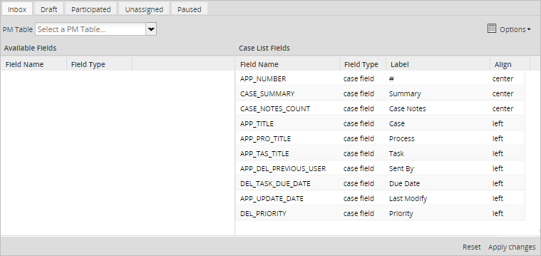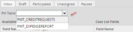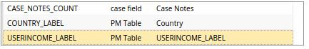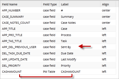 - PM Table: Select a report table to be queried for information to be displayed in the case list. Note that only tables that have an APP_UID field to hold the unique case ID will be displayed, because each record in the table has to be linked to a particular case.