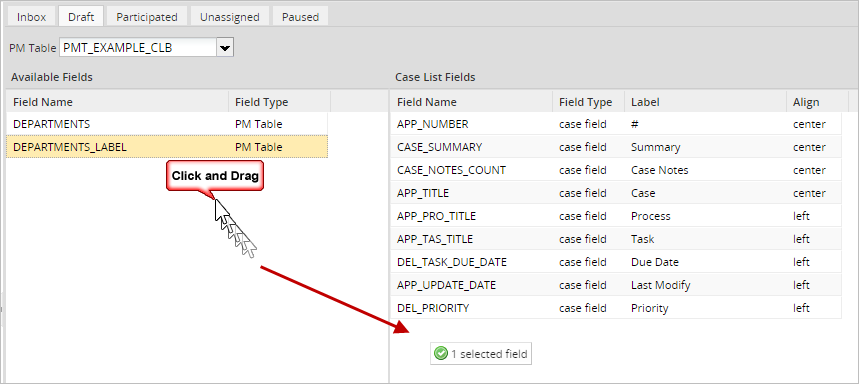 The fields in the PMT_EXAMPLE_CLB table will appear in the list of Available Fields.
