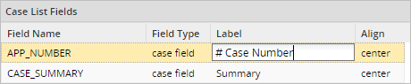 - Case List Fields: Displays the fields used as columns in the case list. The fields order can be changed by clicking on a field and dragging it up or down.
