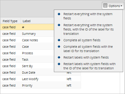 - Complete all system fields, with the ID of the label for its translation: Adds any system fields that were removed to the end of the Case List Fields list and restores the labels of those system fields. Each System Field label will show the ID of the label for its translation.
