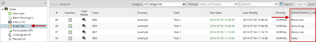 Once a department is selected in the DynaForm and the DynaForm is submitted, a record will be written to the TMP_EXAMPLE_CLB table with the department's data. When users go to HOME > Draft, they will see the department selected for each case in the case list.