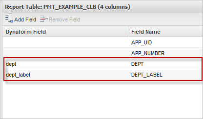 First, create a Report Table named PMT_EXAMPLE_CLB, which will hold a list of departments. Go to ADMIN > Settings > PM Tables. Click on New and select New Report Table. Then add the fields DEPT and DEPT_LABEL to the Report Table, which will be populated by fields from a DynaForm when cases are run.
