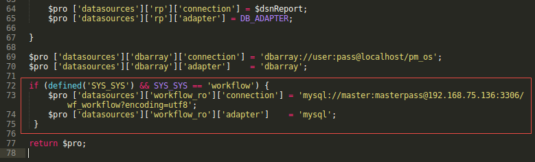 if (defined('SYS_SYS') && SYS_SYS == 'WORKSPACE-NAME') { $pro ['datasources']['workflow_ro']['connection'] = 'mysql://MYSQL-USER:PASSWORD@SLAVE-SERVER-ADDRESS:PORT/ SLAVE-DATABASE-NAME?encoding=utf8'; $pro ['datasources']['workflow_ro']['adapter'] = 'mysql'; } return $pro;