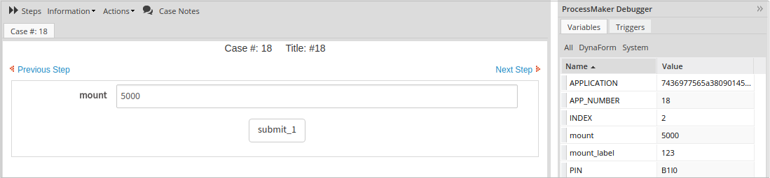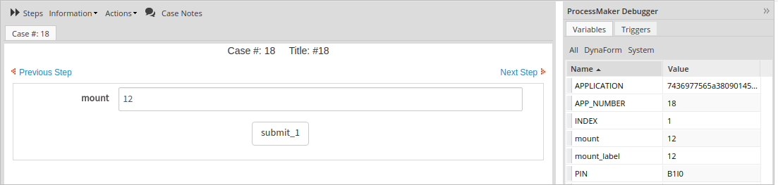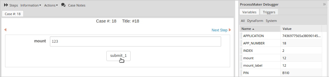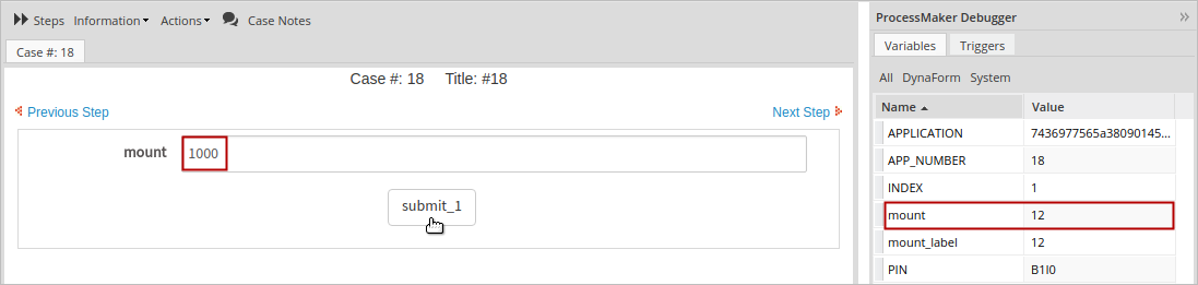 - Note that after clicking on submit, the mount variable and the mount label has the same value assigned in the Dynaform.
