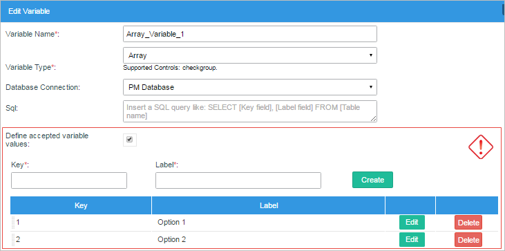 Remember that any value defined in this array variable through the Create Variable window will be ignored.