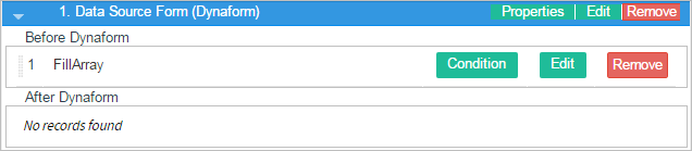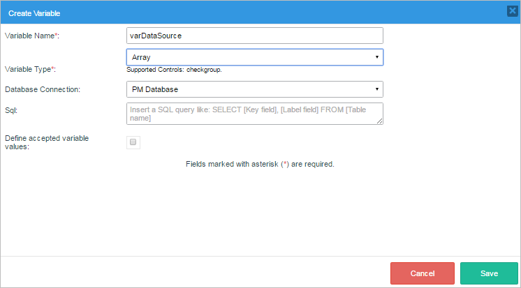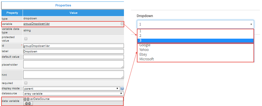 Go back to the Dynaform and click on the Dropdown control. In its properties, select the option "Array Variable" inside the Datasource property and choose the variable varDataSource from the window list.