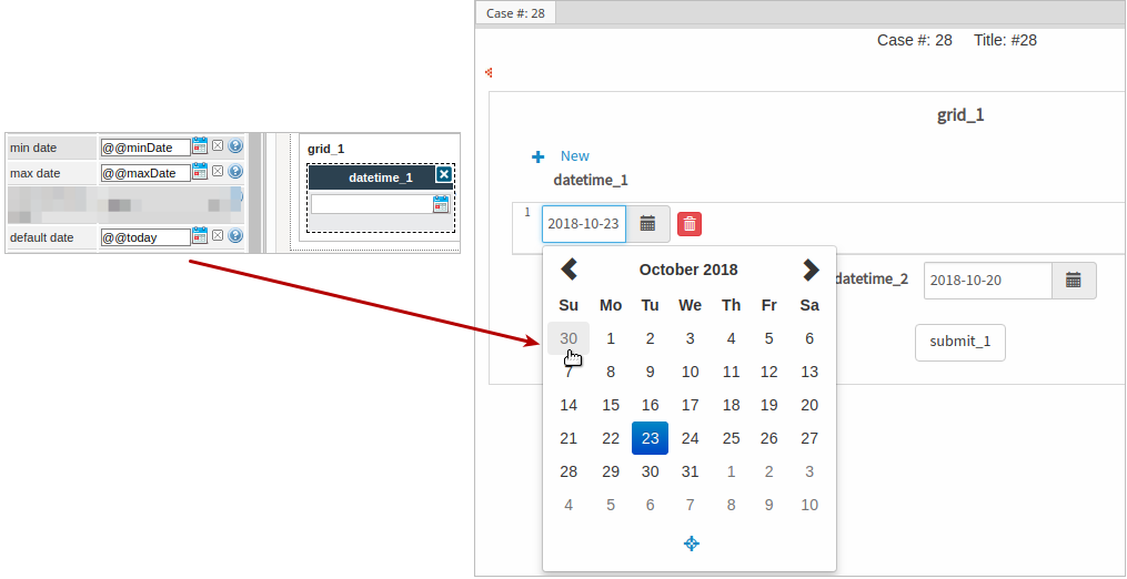 These variables are assigned to the min date, max date, and default date properties of a Datetime control inside a Grid control. When running the case, the Datetime field does not display the values defined in the trigger.