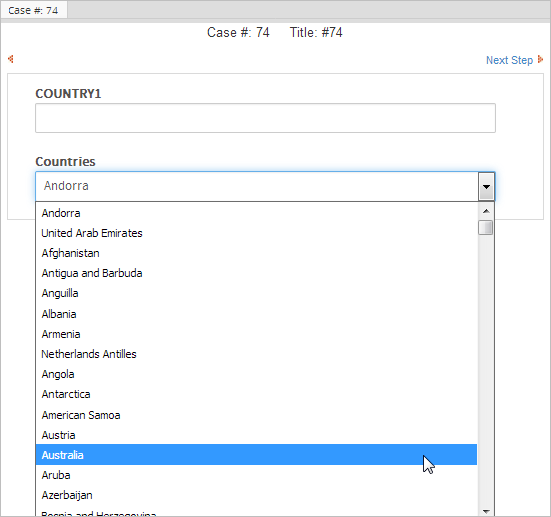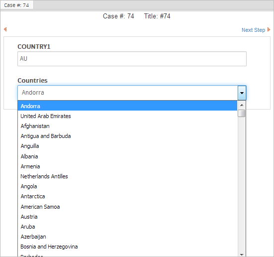 When a case is run, the control will be populated with a list of all countries, excluding "Argentina", because the value of the variable @@COUNTRY2 was set to "AR" in the trigger.